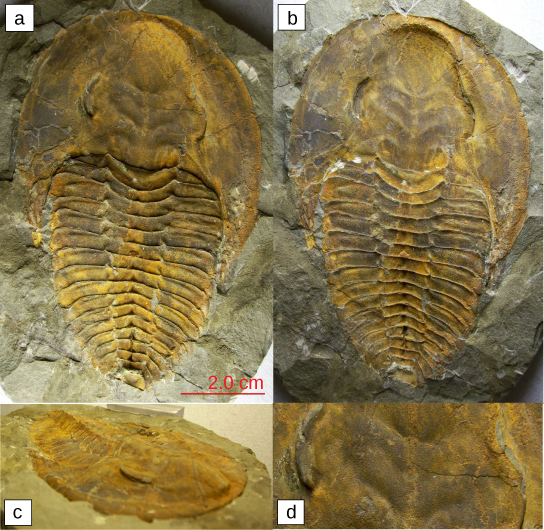 The Cambrian period, occurring between approximately 542–488 million years ago, marks the most rapid evolution of new animal phyla and animal diversity in Earth’s history. It is believed that most of the animal phyla in existence today had their origins during this time, often referred to as the Cambrian explosion ([link]). Echinoderms, mollusks, worms, arthropods, and chordates arose during this period. One of the most dominant species during the Cambrian period was the trilobite, an arthropod that was among the first animals to exhibit a sense of vision ([link]abcd).