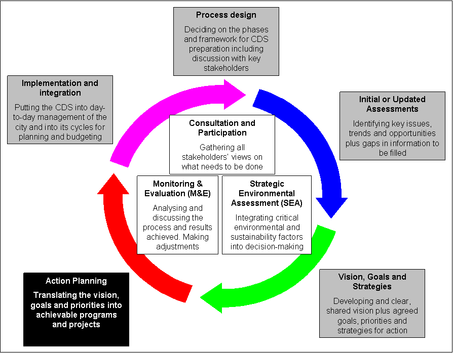 Specifically, SEA provides a process to help you consider your proposed strategies/ actions against critical environmental and sustainability factors (decided upon during the Initial Assessment for the CDS). This means that in addition to comparing. assessing and prioritising intended strategies and actions based on how they fulfil the Vision, Objectives and Strategies of the CDS, the city should consider: