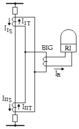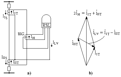 Sơ đồ nguyên lí của bảo vệ có rơle nối qua BIG trên hình 5.5a. Hoạt động của sơ đồ dựa trên cơ sở là trong dòng không cân bằng quá độ khi ngắn mạch ngoài (hình 5.3) thường có chứa thành phần không chu kỳ đáng kể làm dịch chuyển đồ thị biểu diễn trị tức thời của dòng iKCB về 1 phía của trục thời gian.