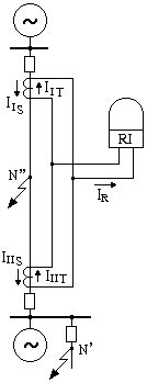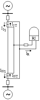 Sơ đồ nguyên lí 1 pha của bảo vệ trên hình 5.9. Các máy biến dòng đặt trên 2 đường dây có tỷ số biến đổi nI như nhau, cuộn thứ của chúng nối với nhau thế nào để nhận được hiệu các dòng pha cùng tên. Rơle dòng 5RI làm nhiệm vụ của bộ phận khởi động, rơle 6RW tác động 2 phía là bộ phận định hướng công suất. Khi chiều dòng điện quy ước như trên hình 5.9, ta có dòng đưa vào các rơle này là IR = IIT - IIIT .