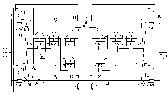 Khi ngắn mạch trên đường dây I ở điểm N’ (hình 5.9), dòng II > III . Về phía trạm A có IR = IIT - IIIT ; còn phía trạm B có IR = 2IIIT. Rơle 5RI ở cả 2 phía đều khởi động. Công suất ngắn mạch trên đường dây I phía A lớn hơn trên đường dây II; do vậy 6’RW khởi động về phía đường dây I và bảo vệ cắt máy cắt 1’MC. Về phía trạm B, công suất ngắn mạch trên đường dây I có dấu dương (hướng từ thanh góp vào đường dây), còn trên đường dây II - âm. Do đó 6”RW cũng khởi động về phía đường dây I và cắt máy cắt 1”MC. Như vậy bảo vệ đảm bảo cắt 2 phía của đường dây hư hỏng I.