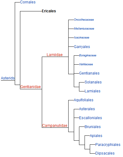 Biểu đồ chỉ ra mối quan hệ phát sinh chủng loài của bộ Thạch nam với các bộ khác trong nhánh Cúc như sau: