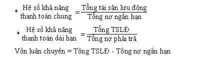 - Chỉ tiêu về khả năng thanh toán: Từng doanh nghiệp phải xem xét khả năng thanh toán của mình trong tình huống phải thanh toán mọi công nợ. Khả năng thanh toán thể hiện tính chấp hành kỉ luật tài chính và thực lực tài chính của doanh nghiệp. Khả năng thanh toán của doanh nghiệp chỉ có thể đảm bảo khi doanh nghiệp sản xuất được nhiều sản phẩm khai thác, sử dụng hợp lí vật tư, nguồn lực... Khi phân tích cần sử dụng các tỉ số để thấy được khả năng thanh toán: