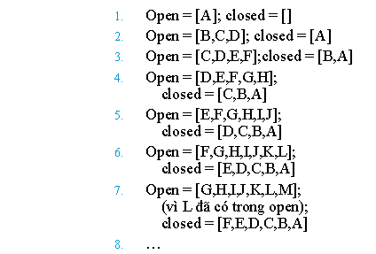Chúng ta thực hiện tìm kiếm rộng bằng cách dùng các danh sách open (mở) và closed (đóng) để theo dõi tiến độ trong không gian trạng thái đó. Danh sách open sẽ liệt kê các trạng thái vừa được sinh ra, nhưng con của chúng chưa được khảo sát. Thứ tự mà các trạng thái bị loại ra khỏi open sẽ xác định thứ tự tìm kiếm. Danh sách closed thì ghi các trạng thái đã được xem xét rồi.