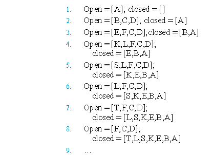 Các trạng thái con sinh ra nhờ các luật suy diễn, các nước đi hợp lệ của trò chơi hoặc các toán tử chuyển trạng thái. Mỗi lần lặp lại sẽ tạo ra tất cả các con của trạng thái X và bổ sung chúng vào danh sách open. Chú ý rằng danh sách open được duy trì dưới dạng một hàng đợi (queue), tức cấu trúc dữ liệu “vào trước ra trước” (first – in – first – out : FIFO). Các trạng thái được bổ sung vào bên phải danh sách và được lấy ra từ bên trái. Cách sắp xếp theo hàng này sẽ sắp xếp việc tìm kiếm đến các trạng thái nằm trong danh sách open lâu nhất, làm cho quá trình trở thành tìm kiếm rộng. Các trạng thái con đã được khảo sát rồi (đã xuất hiện trong danh sách open hoặc danh sách closed) đều bị loại bỏ. Nếu thuật toán kết thúc vì điều kiện của vòng lặp “while” không còn được thoả mãn nữa (open = [ ]) tức là nó đã tìm kiếm xong toàn bộ đồ thị mà không tìm thấy đích mong muốn: Cuộc tìm kiếm thất bại.