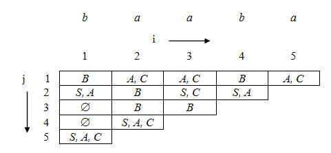 Bảng các Vij cho ở hình 5.8 dưới đây. Dòng đầu tiên trong bảng được cho bởi các bước (1) và (2) trong giải thuật. Vì x11 = x41 = b nên V11 = V41 = {B} vì B là biến duy nhất dẫn xuất ra b, còn x21 = x31 = x51 = a, suy ra V21 = V31 = V51 = {A, C} vì A và C có các luật sinh với a bên vế phải.