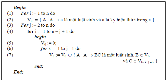 - Với j > i : ta có A ⇒* xij khi và chỉ khi có một luật sinh dạng A → BC và số k, 1 ≤ k < j sao cho B dẫn xuất ra k ký hiệu đầu tiên của xij và C dẫn xuất ra j – k ký hiệu cuối của xij. Có nghĩa là :