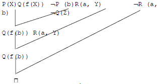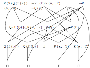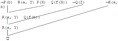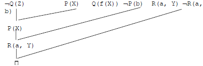 { P(X) □ Q(f(X)), ¬P(b) □ R(a, Y), ¬R(a, b), ¬Q(Z) }