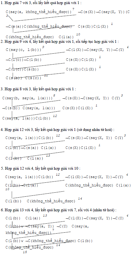 7. Hợp giải 15 với 0, tức C(l(b)) với ¬C(l(b)), ta nhận được mệnh đề rỗng.Vậy ta đã chứng minh được rằng B là một người dối trá.