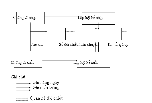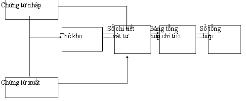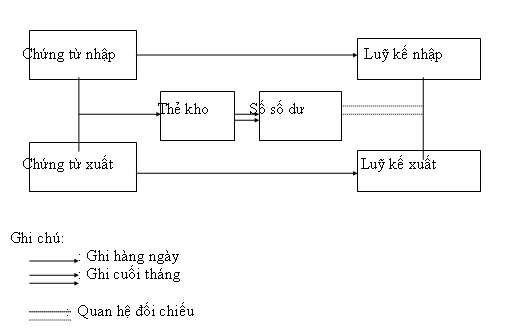 Hằng ngày, khi nhận được các chứng từ nhập, xuất kho vật liệu do thủ kho chuyển lên kế toán vật liệu kiểm tra ghi vào sổ hay thẻ chi tiết liên quan. Cuối tháng, kế toán cộng sổ hay thẻ chi tiết tính ra tổng số xuất- nhập-tồn sau đó đối chiếu với các thẻ kho mà thủ kho phụ trách. Căn cứ vào đó kế toán sẽ lập bảng tổng hợp nhập- xuất- tồn kho vật liệu .
