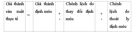 - Trên cơ sở giá thành định mức,số chênh lệch do thay đổi định mức, số chênh lệch do thoát ly định mức để xác định giá thành thực tế của sản phẩm sản xuất trong kỳ theo công thức sau: