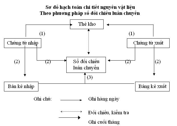 * Tại phòng kế toán: Không mở thẻ kế toán chi tiết mà mở sổ đối chiếu luân chuyển để hạch toán số lượng và số tiền của từng thứ (Danh điểm) nguyên vật liệu theo từng kho. Sổ này ghi mỗi tháng một lần vào cuối tháng trên cơ sở tổng hợp các chứng từ nhập, xuất phát sinh trong tháng của từng nguyên vật liệu, mỗi thứ chỉ ghi một dòng trong sổ. Cuối tháng đối chiếu số lượng nguyên vật liệu trên sổ đối chiếu luân chuyển với thẻ kho, đối chiếu số tiền với kế toán tổng hợp.