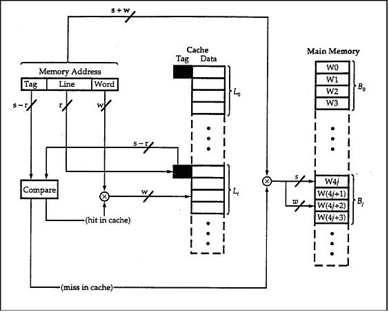 For every memory reference that the CPU makes, the specific line that would hold the reference (if it is has already been copied into the cache) is determined. The tag held in that line is checked to see if the correct block is in the cache