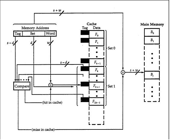 A set-associative cache or associative mapping is inhenrently more complicated than a direct-mapped cache because although the correct cache entry to examine can be computed from the memory address being referenced, a set of n cache entries must be checked to see if the need line is present.