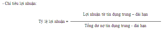Thông qua chỉ tiêu này, ta sẽ thấy được khả năng sinh lời của tín dụng trung - dài hạn. Bất kỳ một khoản tín dụng nào cho dù đó là khoản ngắn hạn hay trung - dài hạn không thể xem là có chất lượng cao nếu nó không đem lại lợi nhuận thực tế cho ngân hàng. Tuy nhiên đối với các ngân hàng, đặc biệt là các ngân hàng quốc doanh thì lợi nhuận nhiều khi không phải là cái đích để ngân hàng hướng tới mà điều quan trọng là thực hiện được chủ trương, chính sách của Đảng và nhà nước. Đặc biệt đối với NHNo & PTNT, với chức năng cho vay trung - dài hạn với mức lãi suất kể cả lãi suất ưu đãi tín dụng để thực hiện các đường lối, chính sách của Đảng và Nhà nước thì trong nhiều trường hợp lợi nhuận không phải là mục tiêu mà ngân hàng cần phải hướng tới. Nói như vậy không có nghĩa là ngân hàng không quan tâm tới lợi nhuận. Vì sự tồn tại và phát triển của bản thân ngan hàng mà ngân hàng không thể cho vay các món vay có lợi nhuận bằng không hoặc nhỏ hơn không. Nhìn chung nếu như c các chỉ tiêu khác giữa các dự án cho vay là như nhau thì dự án cho vay nào đem lại lợi nhuận cao hơn vẫn thường được các ngân hàng ưu ái hơn. Thường thì chỉ tiêu này càng cao càng tốt.