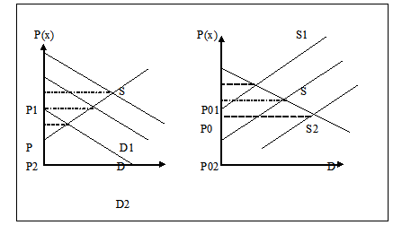 Giả sử gọi P(x) là giá của một mặt hàng X và Q(x) là sản lượng của mặt hàng đó; D và S là hai đường biểu thị cầu và cung về mặt hàng X. Hình 1 cho thấy khi cầu tăng từ D lên D1, mức giá tăng từ P lên P1; khi cầu giảm từ D xuống D2, mức giá giảm từ P xuống P2 hay nói cách khác giá biến đổi tỷ lệ thuận với cầu. Ngược lại, khi lượng cung tăng từ S lên S2, giá giảm từ P0 xuống P02; khi lượng cung giảm từ S xuống S1, giá tăng từ P0 lên P01 hay giá cả có quan hệ tỷ lệ nghịch với lượng cung.