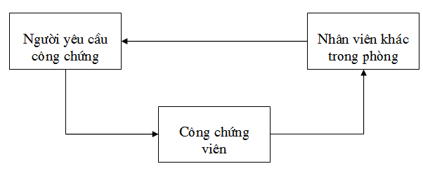 Quy trình công chứng bản sao được thực hiện Người yêu cầu công chứng đưa bản gốc văn bản yêu cầu và bản sao cần công chứng vào cho Công chứng viên, Công chứng viên trực tiếp nhận hồ sơ yêu cầu công chứng, nghiên cứu và xem xét, nếu đủ điều kiện công chứng thì tiến hành ký. Sau đó Công chứng viên chuyển cả bản gốc và bản sao giấy tờ đã ký sang cho các cán bộ chức năng vào sổ, đóng dấu, viết biên lai thu tiền và trả văn bản.