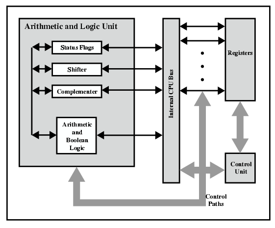 [link] is a slightly more detailed view of the CPU. The data transfer and logic control paths are indicated, including an element labeled internal CPU-bus. This element is needed to transfer data between the various registers and the ALU because the ALU in fact operates only on data in the internal CPU memory.