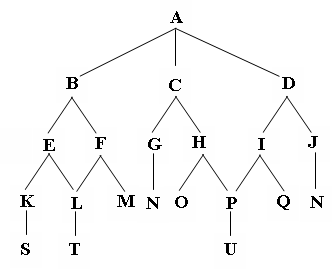 Giả sử P là nút mục tiêu của đồ thị bên dưới, nếu dùng giải thuật tìm kiếm sâu đào sâu nhiều lần để duyệt đồ thị không gian trạng thái này, hãy cho biết danh sách thứ tự các nút mà giải thuật đã duyệt qua.