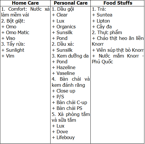 | Công ty | Tổng vốn đầutư ( Triệu USD) | Phần vốn gópcủa Unilever | Địađiểm | Lĩnh vực hoạtđộng |