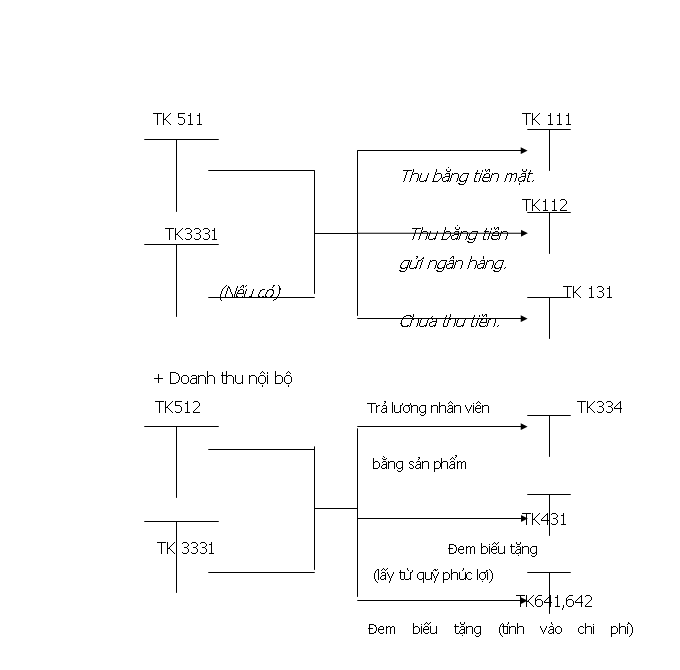 + TK 512 có các tiểu khoản (512.1, 512.2, 512.3) phản ánh chi tiết doanh thu nội bộ (thu nội bộ về hàng hoá, thành phẩm hay dịch vụ).
