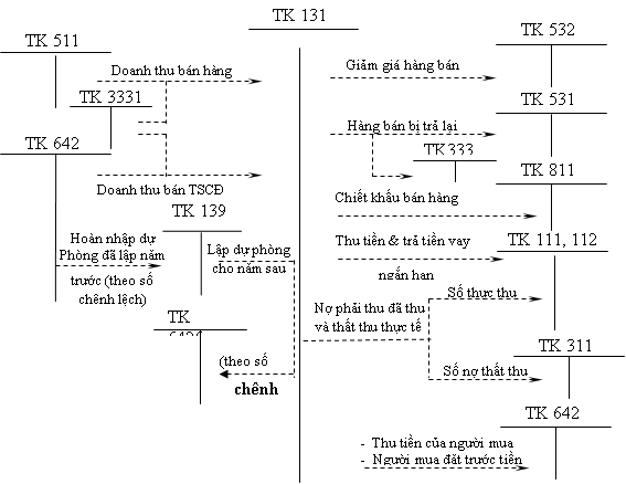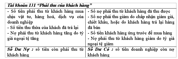 - Phản ánh số nợ phải thu hoặc số tiền ứng trước phải trả của tất cả các khách hàng có quan hệ kinh tế chủ yếu với doanh nghiệp về mua sản phẩm, hàng hoá, dịch vụ và tài sản bán thanh lý khác.