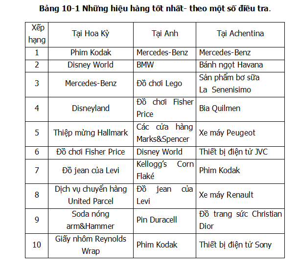 Những hiệu hàng được đánh giá cao nhất tại Hoa Kỳ-với mục đích so sánh- và tại Anh và Achentia được chỉ ra trong biểu 10-1. Có một chút trùng lặp trong danh sách 10 hiệu hàng đứng đầu: chỉ có Kodak và Mercedes Benz là xuất hiện trong cả 3 cột. Ta cũng đồng thời lưu ý rằng: một số ít dịch vụ (Disney world, Disneyland, USP) được tán dương trong danh sách của Mỹ, chỉ có một dịch vụ(Disney world) và một nhà bán lẻ (Marks&spencer) được cân nhắc trong bảng xếp hạng của Anh và chỉ có hàng hoá là xuất hiện trong danh sách của Achentia.