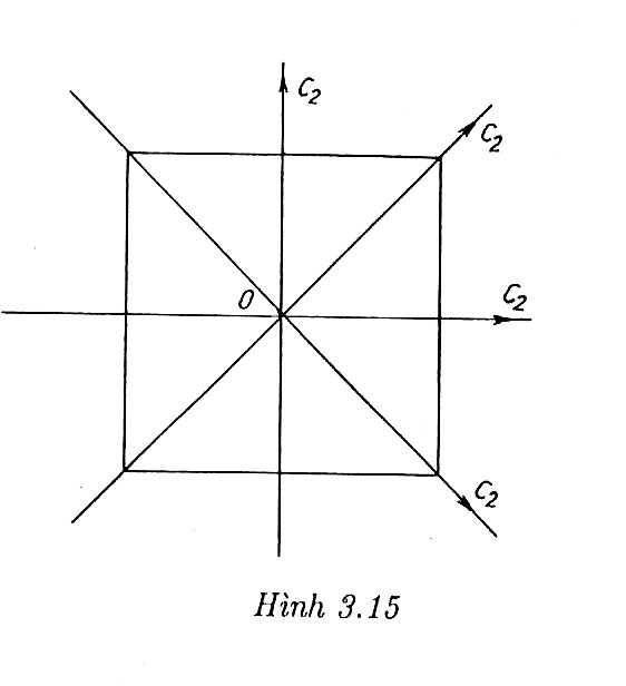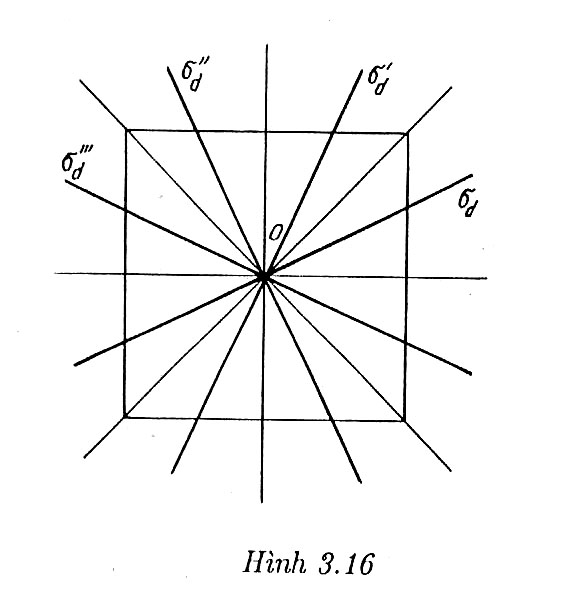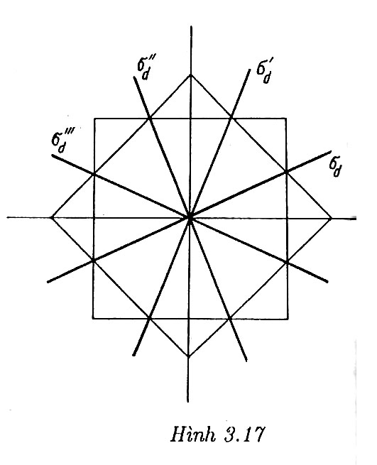 Ngoài các yếu tố đối xứng của nhóm D4 là trục quay C4 và bốn trục quay C2 ta hãy thử đưa thêm các yếu tố đối xứng mới là bốn mặt phẳng phân giác của các góc tạo bởi các trục quay C2 từng đôi một, và xét các phép phản xạ gương , , , qua bốn mặt phẳng gương này (hình 3.16). Rõ ràng rằng hình vuông đối xứng (bất biến) đối với nhóm con D4 không thể đối xứng (bất biến) đối với các phép phản xạ gương , , , . Trái lại, trong các phép phản xạ gương này hình vuông đã cho chuyển thành một hình vuông đồng tâm khác đã quay đi một góc so với hình vuông ban đầu (hình 3.17). Phối hợp cả hai hình vuông ta được một hình sao tám cạnh đối xứng với nhóm C8 mà trục quay là trục Oz. Vậy nhóm D4d phải chứa nhóm con C8. Nhưng ta lại biết rằng không có nhóm điểm tinh thể học nào chứa nhóm con C8. Vậy D4d không thể là nhóm điểm tinh thể học. Nhóm D6d cũng không thể là nhóm điểm tinh thể học.