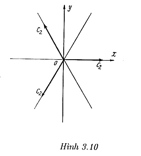 2) Nhóm D3 có bốn yếu tố đối xứng là một trục quay C3 và nằm trong cùng một mặt phẳng. Trên hình 3.10 ta kẻ cả ba trục quay C2 đó, chọn một trục quay trùng bởi trục tọa độ Ox. Trục quay C3 trực giao với mặt phẳng hình vẽ đi qua giao điểm O của ba trục quay C2.