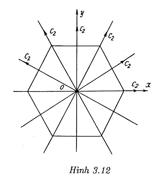 4) Nhóm D6 có bảy yếu tố đối xứng là một trục quay C6 và nằm trong cùng một mặt phẳng. Trên hình 3.12 ta kẻ sáu trục quay C2 đó, chọn hai trục trùng với các trục tọa độ Ox và Oy. Góc giữa hai trục quay C2 là một bội số của . Trục quay C6 trực giao với mặt phẳng hình vẽ và đi qua giao điểm O của các trục quay C2.