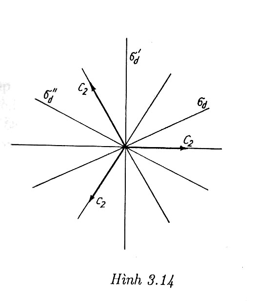 10) Nhóm D3d gồm các yếu tố của nhóm con D3, ba phép phản xạ gương qua ba mặt phẳng gương , , chứa trục quay C3. Trên hình 3.14 ta vẽ ba giao tuyến của ba mặt phẳng gương , , với mặt phẳng tọa độ xOy chứa ba trục quay C2. Trục quay C2 và ba mặt phẳng gương , , là các yếu tố đối xứng.