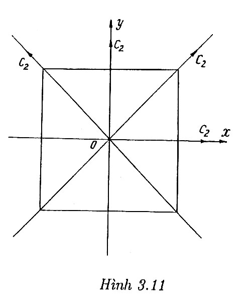 3) Nhóm D4 có 5 yếu tố đố xứng là một trục quay C4 và bốn trục quay C2 trực giao với trục quay C4 và nằm trong cùng một mặt phẳng. Trên hình 3.11 ta kẻ cả bốn trục quay C2 đó, chọn hai trục quay trùng với hai trục tọa độ Ox và Oy. Khi đó hai trục quay C2 khác là các đường phân giác của hai góc vuông tạo bởi các trục Ox và Oy. Trục quay C4 trực giao với mặt phẳng hình vẽ và đi qua giao điểm O của các trục quay C2.