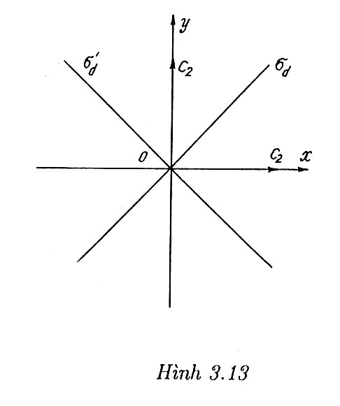 9) Nhóm D2d gồm các yếu tố của nhóm con D2, hai phép phản xạ gương , qua hai mặt phẳng gương chứa một trục quay C2 và là hai mặt phẳng phân giác của hai góc vuông tạo bởi hai trục quay C2 kia, và các tổ hợp của chúng. Ta cũng gọi hai mặt phẳng gương là và . Ta chọn giao tuyến của hai mặt phẳng gương này (một trục quay C2) làm trục Oz, chọn hai trục quay C2 trực giao với Oz làm hai trục Ox và Oy. Trên hình 3.13 ta vẽ hai giao tuyến của hai mặt phẳng gương , với mặt phẳng tọa độ xOy. Ba trục quay C2 và hai mặt phẳng gương , là các yếu tố đối xứng.