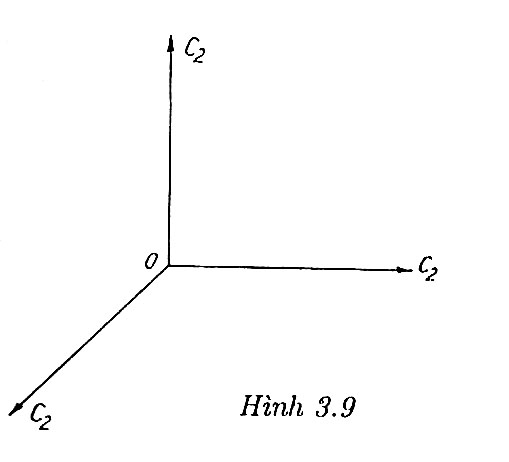 1) Nhóm D2 có ba yếu tố đối xứng là các trục quay C2 vuông góc với nhau từng đôi một (xem hình 3.9). Trong một phép quay C2 quanh một trục nào đó mỗi trục khác chuyển thành chính nó nhưng đổi chiều ngược lại.