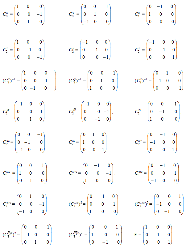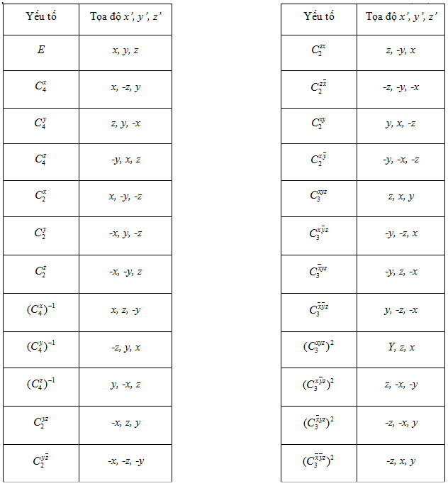 Vậy nhóm O có 24 yếu tố sau đây: E, 3C4, , , 4C3, , 6C2. Các yếu tố đối xứng nhau là: ba trục quay C4, bốn trục quay C3 và sáu trục quay C2.