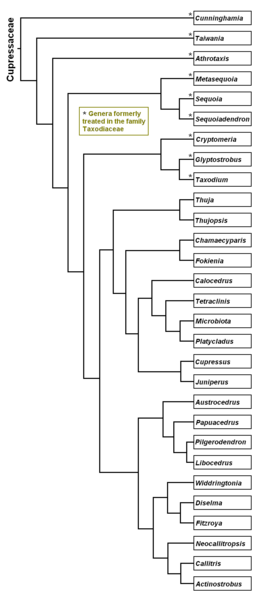Họ Cupressaceae hiện nay được công nhận một cách rộng rãi như là một họ bao gồm cả họ Bụt mọc (Taxodiaceae), mà trước đây được coi như là một họ riêng biệt, nhưng hiện nay các nghiên cứu cho thấy chúng không khác biệt với họ Cupressaceae ở bất kỳ điểm đặc trưng đáng kể nào. Ngoại lệ duy nhất trong họ Taxodiaceae cũ là chi Sciadopitys, về mặt di truyền học là khác biệt với phần còn lại của họ Cupressaceae, và hiện nay nó được coi là một họ riêng chứa chính nó là họ Sciadopityaceae.