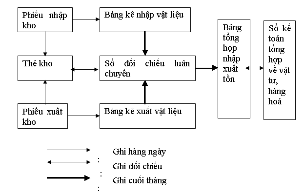 - ở phòng kế toán: Không dùng sổ chi tiết và thẻ kho mà sử dụng sổ đối chiếu luân chuyển để ghi chép tình hình nhập xuất tồn từng danh điểm nhưng chỉ ghi 1 lần cuối tháng.