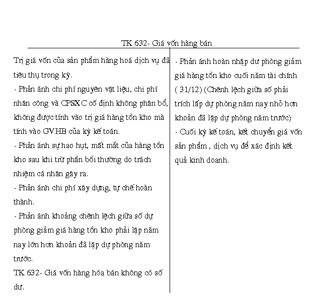 Dùng để phản ánh giá vốn thực tế của hàng hoá , thành phẩm, dịch vụ đã cung cấp, giá thành sản xuất của xây lắp ( đối với doanh nghiệp xây lắp ) đã bán trong kỳ. Ngoài ra còn phản ánh chi phí sản xuất kinh doanh và chi phí xây dựng cơ bản dơ dang vượt trên mức bình thường, số trích lập hoàn nhập dự phòng giảm giá hàng tồn kho.