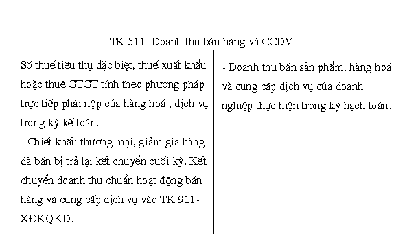 TK 511- Doanh thu bán hàng và cung câp dịch vụ một kỳ kế toán từ các giao dịch và các nghiệp vụ bán hàng và cung cấp dịch vụ.
