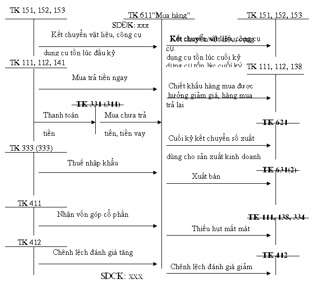 Sơ đồ kế toán tổng hợp vật liệu, công cụ dụng theo phương pháp kiểm kê định kỳ.