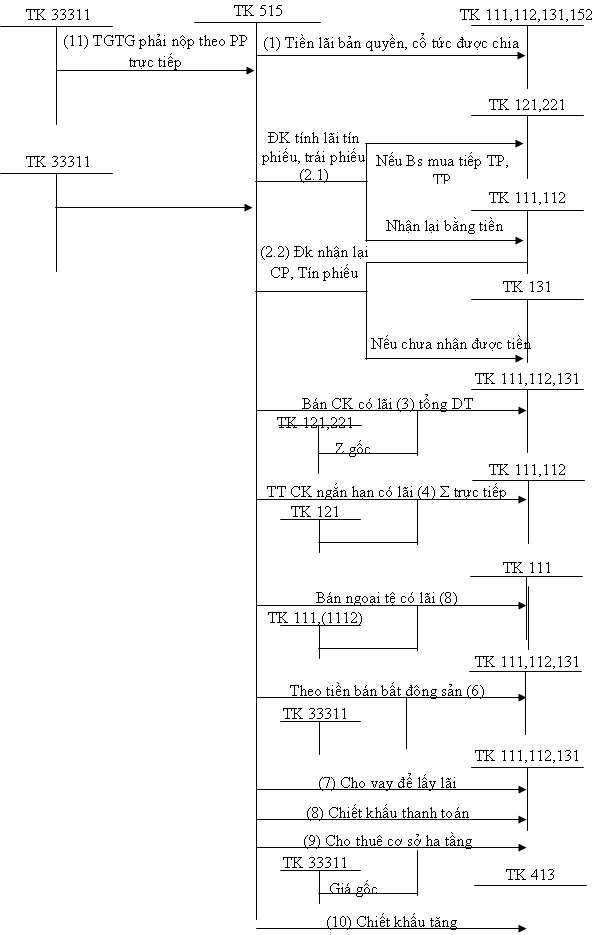 * TK 515: Doanh thu hoạt động tái chính. Được dùng để phản ánh doanh thu tiền lãi, tiền bản quyền tổ chức lợi nhuận được chia và doanh thu hoạt động tài chính của chức năng.