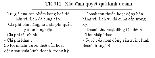TK 911- Xác định kết qủa kinh doanh được sử dụng để xác định toàn bộ kết quả hoạt động sản xuất kinh doanh được sử dụng để xác định toàn bộ kết quả hoạt động sản xuất kinh doanh và các hoạt động khác của doanh nghiệp trong một kỳ kế toán.