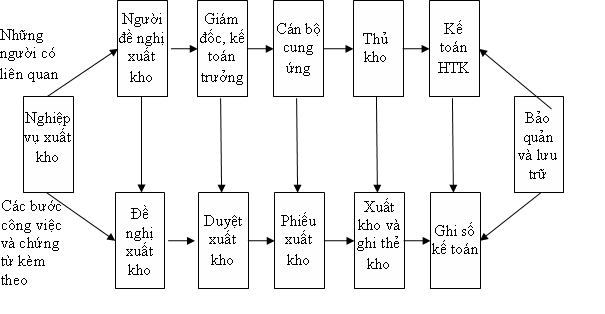Bộ phận kho phải chịu trách nhiệm về toàn bộ số hàng hóa mà mình quản lý, do đó tất cả các trường hợp xuất vật tư, hàng hóa đều phải có phiếu yêu cầu sử dụng đã được phê duyệt hay phải có đơn đặt hàng. Căn cứ vào phiếu xuất kho thủ kho và kế toán vật tư ghi sổ và hạch toán. Doanh nghiệp tiến hành các công việc: