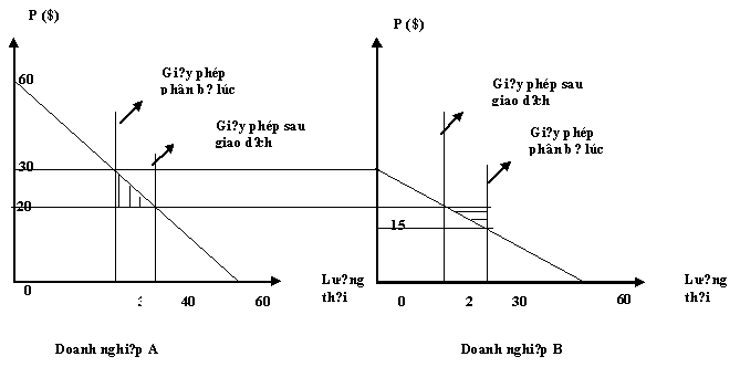 Nhờ có mua bán giấy phép mà tổng chi phí giảm thải đối với xã hội giảm được 75$, trong đó A được lợi 50$ và B được lợi 25$. Phần được lợi của 2 doanh nghiệp này được thể hiện bằng diện tích hình tam giác được gạch chéo trong hình ( 2.30)