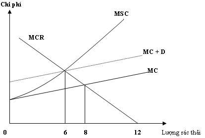 Lượng tái sử dụng hiệu quả là 6 đơn vị, tại đó, chi phí cận biên của tái sử dụng rác MCR bằng chi phí cận biên xã hội của việc thải rác MSC (lượng thải là 6 đơn vị)