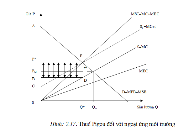 Như vậy, bằng cách đánh thuế t* = MEC(Q*) doanh nghiệp sẽ có một động cơ kinh tế để sản xuất tại mức sản lượng Q* là mức tối ưu đối với xã hội và vì vậy cũng tạo ra mức ô nhiễm tối ưu W*.