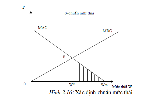 Khi chỉ đơn thuần quy định chuẩn mức thải, chi phí môi trường của doanh nghiệp sẽ chính là chi phí để làm giảm lượng thải từ Wm về W*, đó chính là diện tích tam giác W*EWm trong hình 2.16.