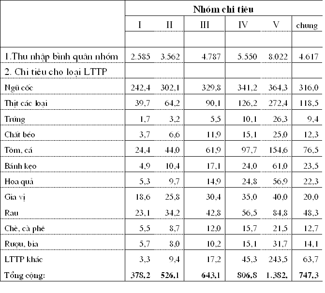 Biểu 8.1: Chi tiêu lương thực thực phẩm bình quân đầu người theo loại lương thực thực phẩm và nhóm chi tiêu.