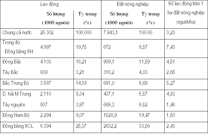 Năm 1998 cả nước có 10.981 ngàn hộ nông nghiệp với 52.668 ngàn nhân khẩu, trong đó có 25.302 ngàn lao động chiếm 68,64% tổng lao động xã hội. Như vậy dân số và lao động nông nghiệp còn chiếm tỷ trọng lớn, nhưng phân bố không đều giữa các vùng, thường tập trung ở vùng đồng bằng và ven biển. Năm 1998 vùng đồng bằng sông Hồng có 4.997 ngàn lao động nông nghiệp chiếm 19,75% lao động nông nghiệp cả nước nhưng diện tích đất nông nghiệp chỉ chiếm 8,57% diện tích đất nông nghiệp cả nước, tính ra cứ 1 ha có 7,43 lao động, bằng 230% mức bình quân chung cả nước và bằng 49,5% của Tây nguyên và Đông nam bộ. Vùng Bắc Trung bộ có 3.587 ngàn lao động chiếm 14,18% tổng lao động nông nghiệp cả nước nhưng chỉ có 8,68% diện tích đất nông nghiệp và tính ra trên 1 ha có 5,27 lao động. Điều đó có thể thấy ở biểu sau: