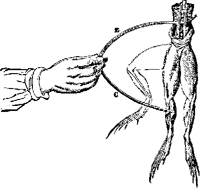 Trong một số thí nghiệm tương tự, Swammerdam kích thích dây thần kinh vận dộng bằng cách nén nó. Trên thực tế, trong thí nghiệm này kích thích đạt được bằng cách kéo dây thần kinh vận động bằng một sợi dây (c) làm bằng bạc tỳ vào với một cái vòng (d) làm bằng đồng. Dựa trên các định luật về điện hóa, hai kim loại không giống nhau trong thí nghiệm này được nhúng vào chất điện phân cung cấp bởi mô, là nguồn gốc của lực điện động (emf) và liên quan đến dòng điện. Dòng điện chảy qua kim loại và mô, và phản ứng với kích thích (kích hoạt) của thần kinh trong mẫu mô. Các dây thần kinh, một khi đã kích hoạt, tạo ra một dòng điện của chính nó. Đó là nguồn gốc của sinh học, được điều khiển bởi các nguồn trong màng các dây thần kinh và cơ, và là khác biệt với các dòng kích thích kể trên. Các vùng hoạt động của sự lan truyền hưng phấn từ thần kinh đến cơ ngay lập tức gây ra sự co cơ. Đặc tính điện của thần kinh và cơ hình thành nên chủ đề “điện sinh học” là chủ đề trung tâm của bài luận này.